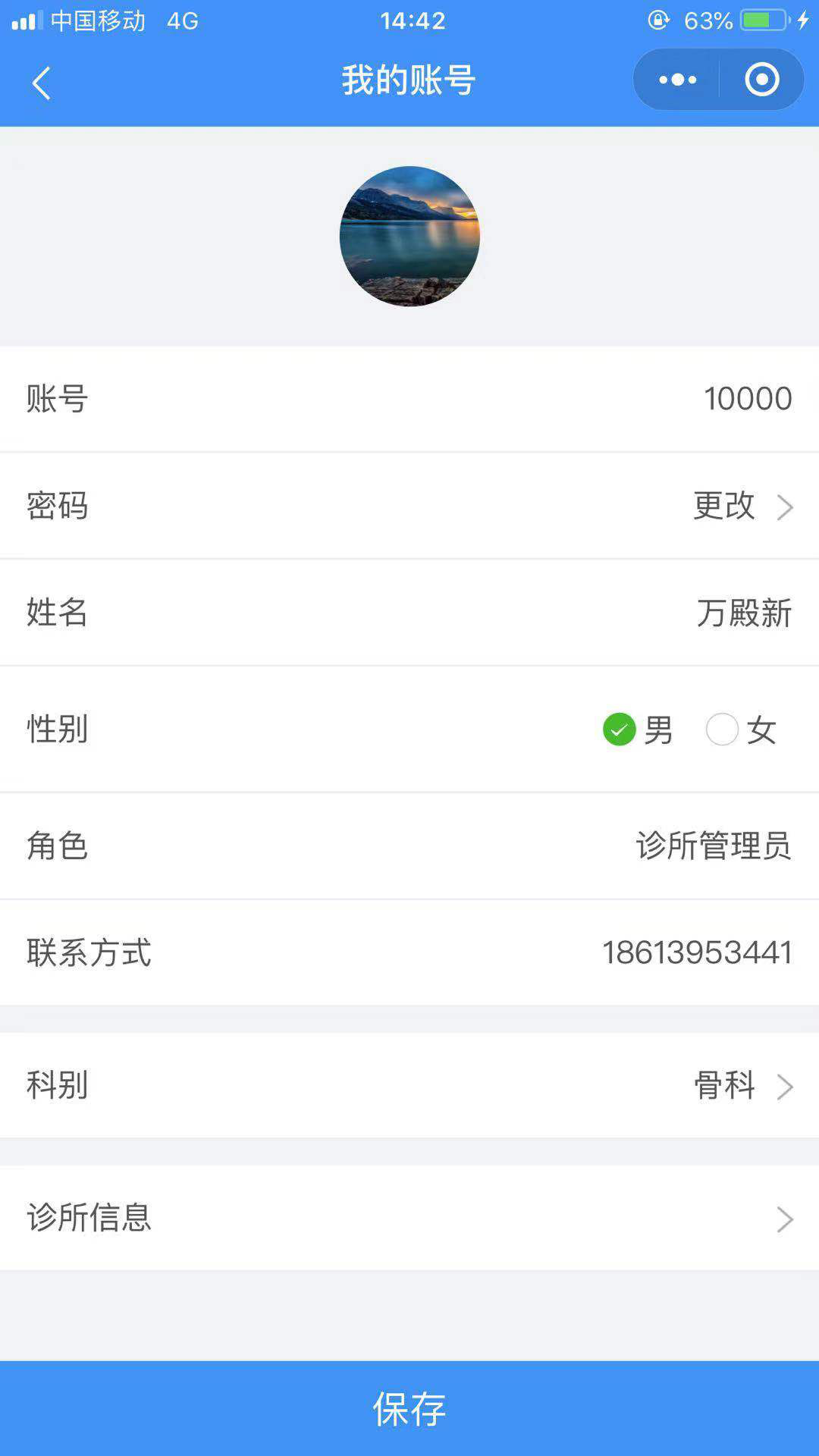 在【个人中心】→【我的账号】模块中可以更改当前账号的姓名、性别、密码,查看所属诊所的信息。